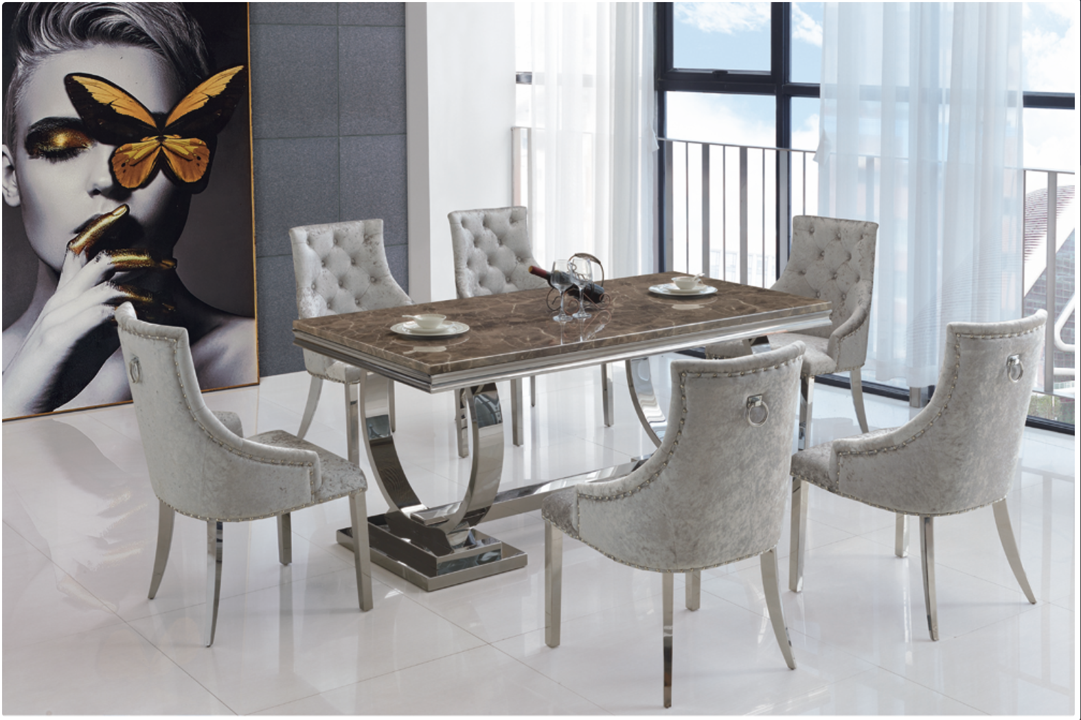 High Quality chair in grey fabric Stainless steel frame Langa marbel table -£754