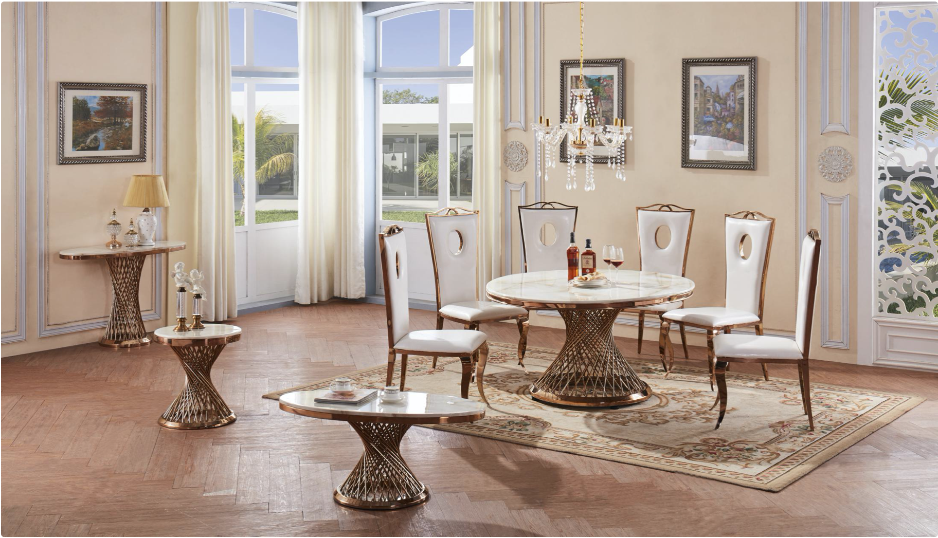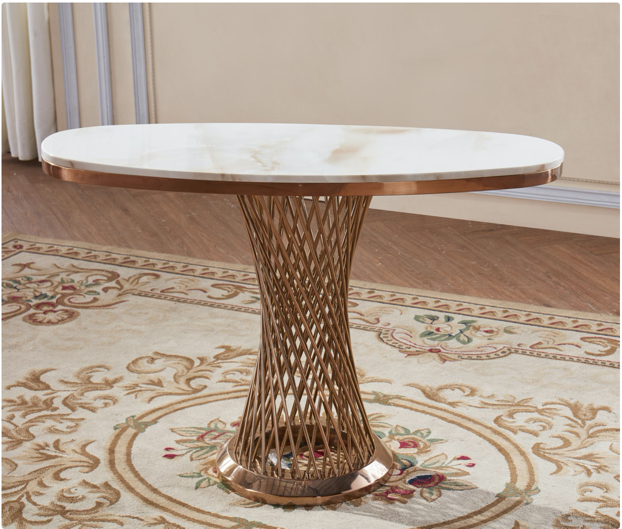 Natural Stone with Marble Effect and Lacquer Finish, White and Stainless Steel, Rose Gold Colour, Pescara Console Table Oval 1100W x 400D x 770H